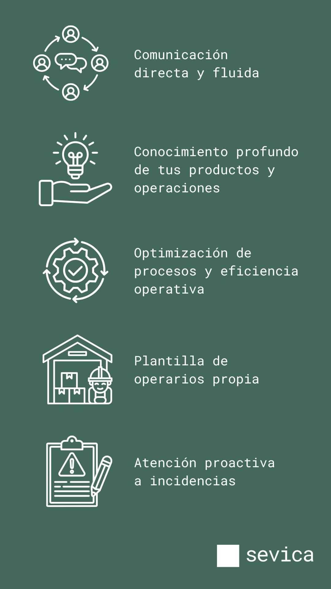 En Sevica, estos elementos son parte de nuestro ADN: gestores de cuenta dedicados, plantilla propia y procesos diseñados para proteger tu marca. Esto garantiza que tu operación logística funcione sin fricciones, permitiéndote centrarte en hacer crecer tu negocio.